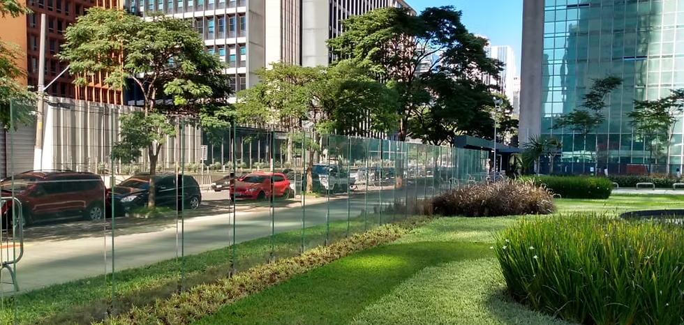 O histórico Edifício Cetenco Plaza, na Avenida Paulista, em São Paulo, recebeu um muro de vidro para proteger seu belo jardim projetado pelo renomado paisagista Benedito Abbud.
